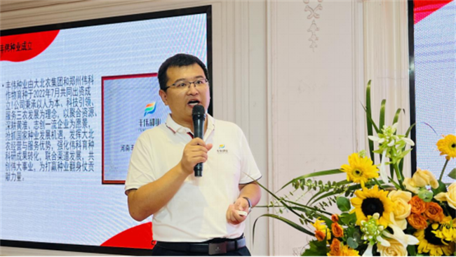 豐偉種業(yè)銷(xiāo)售經(jīng)理席鵬飛老師向大家匯報(bào)了《豐偉種業(yè)發(fā)展歷程》,打贏種業(yè)翻身仗,豐功偉業(yè)攜手創(chuàng)!2022年7月,大北農(nóng)集團(tuán)與偉科育種科企強(qiáng)強(qiáng)聯(lián)合,共同成立豐偉種業(yè),打造種業(yè)新星。豐偉種業(yè)背靠大北農(nóng)集團(tuán)和鄭州偉科育種,發(fā)揮大北農(nóng)經(jīng)營(yíng)與服務(wù)優(yōu)勢(shì),強(qiáng)化偉科育種科研成果轉(zhuǎn)化,聯(lián)合渠道發(fā)展,共創(chuàng)偉大事業(yè)。
