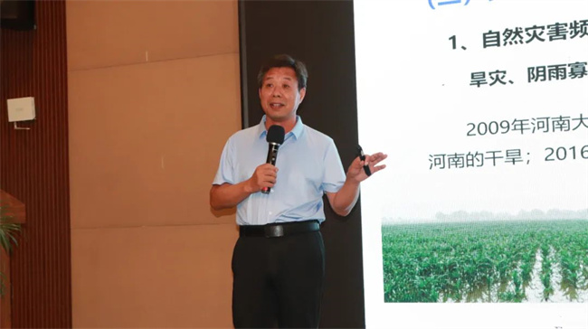 會議邀請河南農業(yè)大學學術副校長湯繼華教授作了題為《黃淮海玉米育種目標與發(fā)展趨勢》的報告。湯教授在報告中詳細介紹了黃淮海夏玉米生產現(xiàn)狀與存在問題、育種目標和育種策略;并就現(xiàn)代高效育種技術,利用創(chuàng)新核心種質,簡化制種提質量,科企、校企聯(lián)合攻關的黃淮麥夏玉米育種策略,解決產量提升等工作進行解讀。同時,湯教授向參會嘉賓介紹了和商都種業(yè)的科研合作情況,以及即將審定的玉米新組合等情況,強大的科研團隊、新組合儲備助推商都種業(yè)快速騰飛。