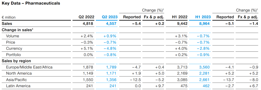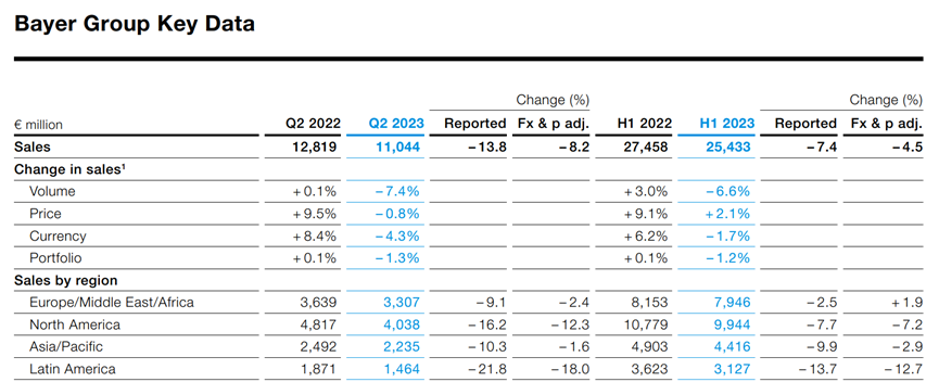 8月8日,拜耳發(fā)布了其2023Q2報(bào)告,報(bào)告顯示拜耳整體2023年上半年收入254.33億歐元,同比下降4.5%,Q2收入110.44億歐元,按照區(qū)域劃分,北美2023年上半年107.79億歐元,歐洲/中東/非洲81.53億歐元,亞太區(qū)域44.16億歐元,拉丁美洲31.27億歐元。