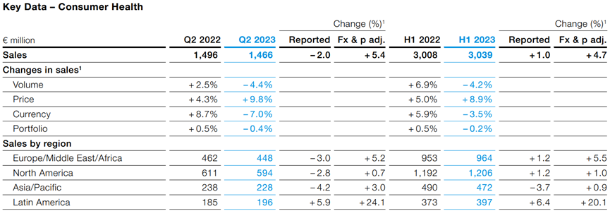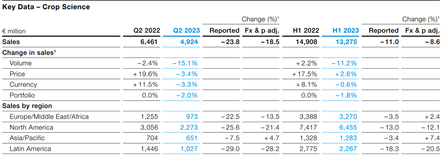 拜耳一共三大塊業(yè)務(wù),分別是農(nóng)作物科學(xué)Crop Science、制藥業(yè)務(wù)Pharmaceuticals及消費(fèi)者健康業(yè)務(wù)Consumer Health,這三大業(yè)務(wù)在2023年上半年分別為132.75億歐元、89.64億歐元和30.39億歐元,農(nóng)作物科學(xué)受到草甘膦產(chǎn)品下滑影響,上半年下降8.6%,其中Q2下降18.5%,而制藥業(yè)務(wù)相對(duì)穩(wěn)定,消費(fèi)者健康業(yè)務(wù)創(chuàng)新高。