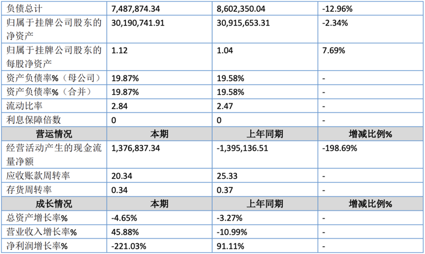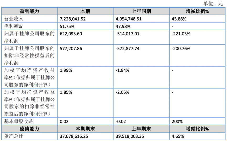 2023年1月1日-2023年6月30日,公司實(shí)現(xiàn)營(yíng)業(yè)收入722.80萬(wàn)元,同比增長(zhǎng)45.88%,凈利潤(rùn)62.21萬(wàn)元,同比扭虧為盈,去年同期虧損51.40萬(wàn)元。