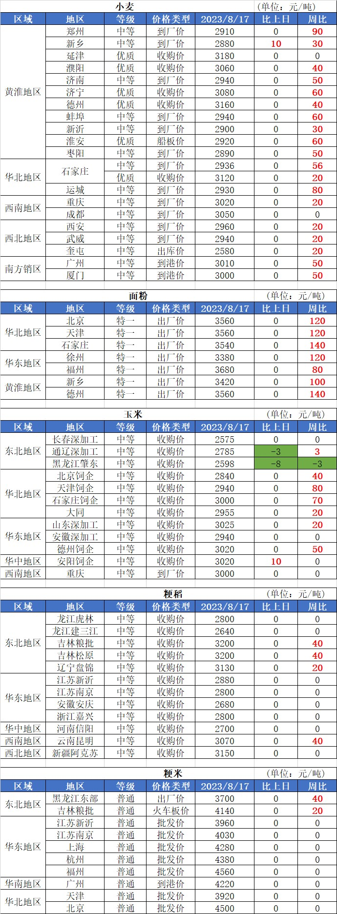 2、8月17日國內(nèi)玉米價格小幅下跌,其中:華北地區(qū)、南方銷區(qū)玉米價格基本穩(wěn)定;南北港口、山東地區(qū)玉米價格基本穩(wěn)定,局部價格下跌,跌幅4-50元/噸;東北地區(qū)玉米價格基本穩(wěn)定,局部漲跌,變化幅度15-20元/噸。