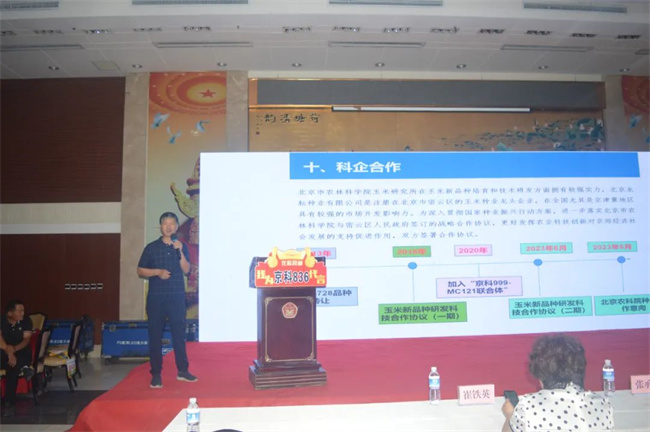 北京市農(nóng)林科學(xué)院玉米研究所副所長(zhǎng)王元東研究員介紹了北京農(nóng)林科學(xué)院從玉米優(yōu)良品種選育背景和玉米品種更新?lián)Q代如何提高玉米單產(chǎn)研究進(jìn)展,并就經(jīng)銷商朋友關(guān)注的玉米“好品種”評(píng)價(jià)標(biāo)準(zhǔn)做詳細(xì)分解。他表示,好的玉米品種需要好的新種質(zhì),龍?jiān)欧N業(yè)與北京農(nóng)農(nóng)林科學(xué)院玉米研究所長(zhǎng)期保持良好的科企合作,依托玉米所豐富的種質(zhì)資源,培育出一批優(yōu)良品種受到市場(chǎng)歡迎,并得到大力推廣應(yīng)用,為提高玉米單產(chǎn)水平發(fā)揮了重要作用。