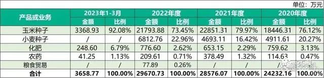 該公司業(yè)務(wù)集中于玉米和小麥種子。招股書顯示,玉米和小麥種子業(yè)務(wù)近三年及2023年第一季度的營收占比分別達到96.39%、96.39%、96.41%、92.08%。