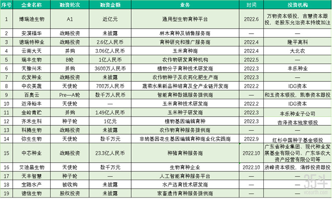在技術(shù)細分領(lǐng)域上,基因育種很受資本看重,因為這些能直接帶來產(chǎn)量或質(zhì)量的提升。比如,基因編輯企業(yè)——武漢雙綠源創(chuàng)芯科技研究院宣完成數(shù)千萬元融資、蘇州齊禾生科生物宣布完成逾億元的種子輪融資、艾迪晶生物宣布獲得數(shù)千萬元天使輪融資;專注轉(zhuǎn)基因生物新品種培育的杭州瑞豐生物完成B輪融資;溫氏股份旗下專業(yè)化豬育種科技公司——廣東中芯種業(yè)增資23.33億元,公司估值超100億元。