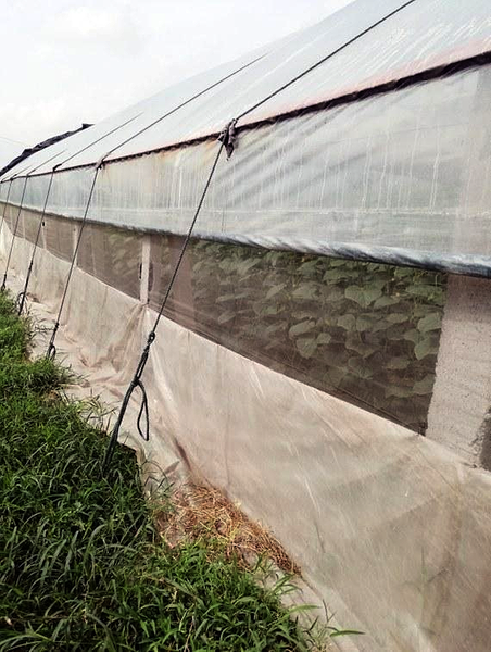 設(shè)置擋雨膜擋雨又降濕。不管是溫室還是拱棚,都具有一定的弧度。而當(dāng)棚內(nèi)濕度大時(shí),棚膜上的水會順著棚膜或鋼管滴落在前臉處,增加前臉處濕度,而且前臉地勢相對低洼,也是雨水進(jìn)棚的主要通道。特別是夏季溫度高時(shí),菜農(nóng)往往敞開大棚前臉通風(fēng)口通風(fēng),但是夏季突襲的降雨常常讓菜農(nóng)來不及關(guān)閉風(fēng)口,也很容易導(dǎo)致雨水進(jìn)棚。為降低前臉濕度,有的菜農(nóng)在前臉處鋪設(shè)寬度在40厘米左右的稻殼或秸稈進(jìn)行吸濕,雖然效果不錯(cuò),但同時(shí)也在一定程度上減少了部分種植面積。經(jīng)驗(yàn)菜農(nóng)的做法是在前臉懸掛一張膜,既能起到很好的降濕作用,也能防止雨水進(jìn)棚。