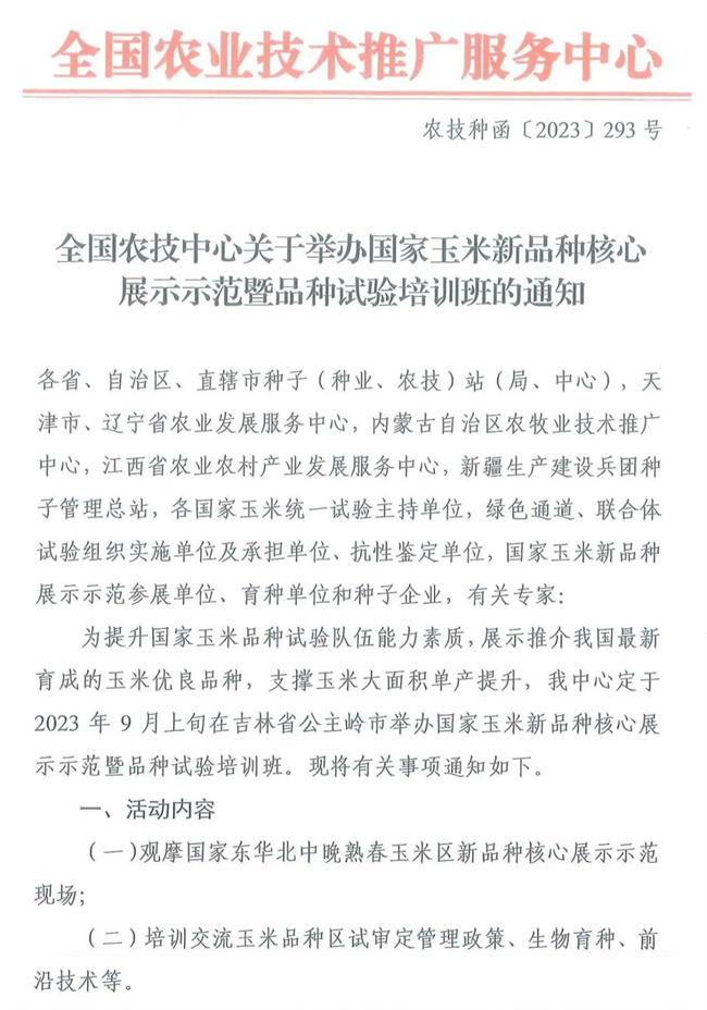 全國農(nóng)技中心關(guān)于舉辦國家玉米新品種核心展示示范暨品種試驗培訓(xùn)班的通知