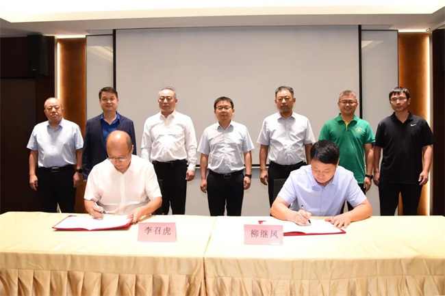 ▲華中農(nóng)業(yè)大學(xué)校長李召虎和河北沃土種業(yè)股份有限公司董事長柳繼鳳共同簽訂合作研究協(xié)議(華中農(nóng)業(yè)大學(xué)蔣朝常 攝)