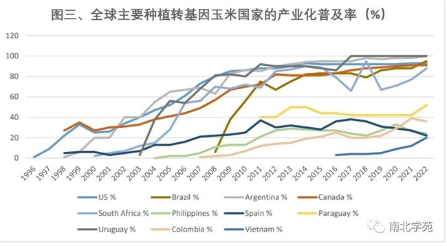 二、全球轉(zhuǎn)基因玉米產(chǎn)業(yè)化國家的種植普及率