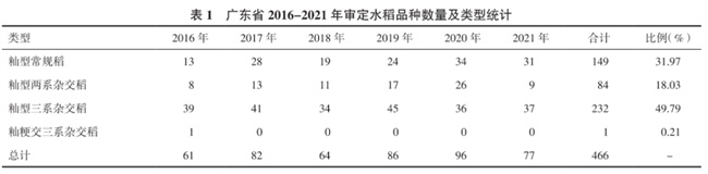 從表1可知,廣東省2016-2021年審定通過(guò)的水稻品種共466個(gè),其中2016年61個(gè)、2017年82個(gè)、2018年64個(gè)、2019年86個(gè)、2020年96個(gè)、2021年77個(gè),年平均審定78個(gè)品種;廣東省審定通過(guò)的水稻品種類(lèi)型主要是秈型常規(guī)稻、秈型兩系雜交稻和秈型三系雜交稻,其品種數(shù)量分別為149個(gè)、84個(gè)、232個(gè),分別占總數(shù)的31.97%、18.03%和49.79%,均適宜在廣東省內(nèi)早晚造種植。有21個(gè)香稻通過(guò)審定,包含秈型常規(guī)稻11個(gè)和秈型三系雜交稻10個(gè);有18個(gè)有色稻通過(guò)審定,其中紅米17個(gè)(包含9個(gè)秈型常規(guī)稻、6個(gè)秈型兩系雜交稻、2個(gè)秈型三系雜交稻)、黑米1個(gè)(南兩優(yōu)黑一號(hào))。