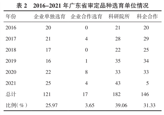 廣東省2016-2021年通過(guò)審定的466個(gè)水稻品種主要由科研院所、企業(yè)以及科企合作選育,企業(yè)合作選育的品種數(shù)量較少,其中由科研院所選育的品種數(shù)量為182個(gè),占39.06%;由企業(yè)單獨(dú)選育的品種數(shù)量為121個(gè),占25.97%;由科研院所和企業(yè)合作選育的品種數(shù)量為146個(gè),占31.33%;由企業(yè)間合作選育的品種數(shù)量為17個(gè),僅占3.65%(表2)。