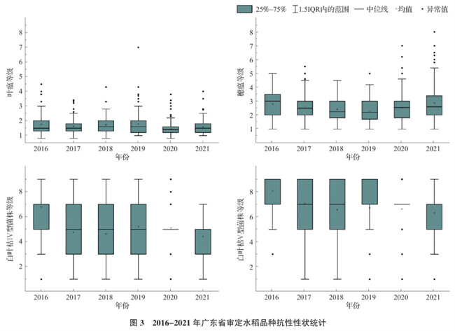 廣東省2016-2021年各年審定通過(guò)的水稻品種葉瘟和穗瘟等級(jí)較低且波動(dòng)幅度較?。▓D3),其審定品種的葉瘟等級(jí)范圍在0.8~3.0之間,50%的品種葉瘟等級(jí)在1.2~2.0之間,葉瘟平均等級(jí)、中位數(shù)等級(jí)分別在1.45~1.76、1.4~1.6之間;審定品種的穗瘟等級(jí)范圍在1.0~5.4之間,50%的品種數(shù)量穗瘟等級(jí)在1.7~3.5之間,穗瘟平均等級(jí)、中位數(shù)等級(jí)分別在2.27~2.81、2.2~3.0之間。白葉枯菌株的抗性有一定的波動(dòng),2016年審定水稻品種的白葉枯菌株抗性弱于其他年份,2016年Ⅳ型菌株抗性的平均等級(jí)、中位數(shù)等級(jí)分別為6.79、7.0,Ⅴ型菌株抗性的平均等級(jí)、中位數(shù)等級(jí)分別為8.07、7.0,而2017-2021年份的Ⅳ型菌株抗性平均等級(jí)、中位數(shù)等級(jí)分別為4.42~5.21、5.0,Ⅴ型菌株抗性平均等級(jí)、中位數(shù)等級(jí)分別為6.30~7.07、7.0(圖3)。