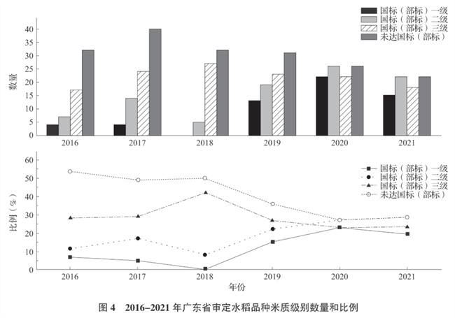 廣東省2016-2021年審定的水稻品種中有282個(gè)水稻品種米質(zhì)達(dá)到國(guó)標(biāo)優(yōu)質(zhì)三級(jí)(部標(biāo)三級(jí))及以上,其中秈型常規(guī)稻118個(gè)、秈型三系雜交稻113個(gè)、秈型兩系雜交稻51個(gè),共占審定品種總數(shù)的60.52%(表6)。廣東省審定通過(guò)的水稻品種達(dá)到國(guó)標(biāo)一級(jí)(部標(biāo)一級(jí))和國(guó)標(biāo)二級(jí)(部標(biāo)二級(jí))的優(yōu)質(zhì)水稻品種比例整體增加,未達(dá)國(guó)標(biāo)(部標(biāo))米質(zhì)優(yōu)質(zhì)的品種數(shù)量比例由2016-2018年的48.78%~54.10%逐漸下降至2020年的27.08%和2021年的28.57%,達(dá)到國(guó)標(biāo)(部標(biāo))優(yōu)質(zhì)的水稻品種數(shù)量占比整體增加(圖4)。2016-2021年廣東省審定的水稻品種的堊白度逐年下降,稻米透明度級(jí)別逐年降低,稻米的長(zhǎng)寬比在2020-2021年有增加的趨勢(shì),所審定品種的整體米質(zhì)性狀有一定的提升(表7)。