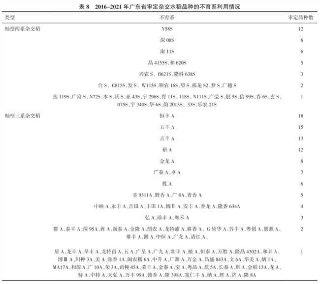 由表8可知,2016-2021年廣東省審定通過(guò)的317個(gè)雜交稻品種共使用了129個(gè)不育系,其中兩系不育系38個(gè)、三系不育系91個(gè)。所審定的317個(gè)雜交稻中,有180個(gè)雜交稻利用了本省選育的52個(gè)不育系,137個(gè)雜交稻利用了外省選育的77個(gè)不育系,表明廣東省審定雜交稻利用的不育系來(lái)源較廣,對(duì)外省的不育系依賴(lài)程度不高;總共有71個(gè)不育系僅有1個(gè)品種通過(guò)審定,27個(gè)不育系有2個(gè)品種通過(guò)品種審定,分別占不育系總數(shù)的55.04%和20.93%。恒豐A所配組合中通過(guò)審定的水稻品種最多(共18個(gè)),其次是五豐A(15個(gè))、吉豐A(13個(gè))、Y58S和裕A(12個(gè))、深08S和金龍A(8個(gè))、廣泰A和卓A(7個(gè))、南11S和勝A(6個(gè)),表明這些不育系具備較高的配合力。(參考文獻(xiàn)略)
