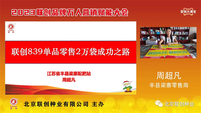 豐縣梁寨零售商周超凡女士分享《聯(lián)創(chuàng)839單品零售2萬(wàn)袋成功之路》。