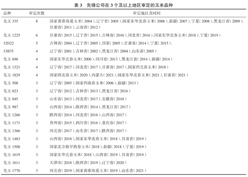 先鋒公司在3個(gè)及以上地區(qū)審定的品種分析