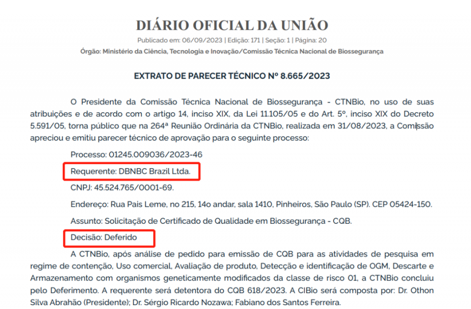 巴西時(shí)間2023年9月6日,巴西官方網(wǎng)站正式公告了巴西國(guó)家生物安全技術(shù)委員會(huì)(CTNBio)2023年8月31日的會(huì)議決議,其中大北農(nóng)生物技術(shù)旗下全資子公司巴西DBNBC有限責(zé)任公司(DBNBC Brazil Ltda.,以下簡(jiǎn)稱巴西子公司),成功獲批 “生物安全許可證”(CQB)。