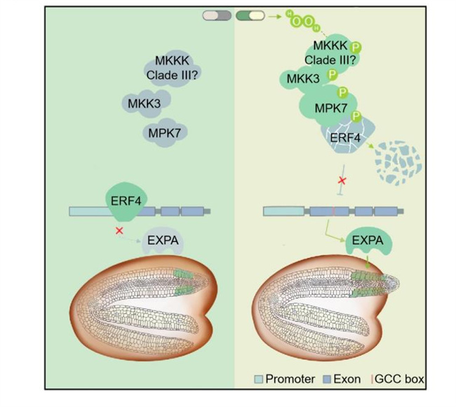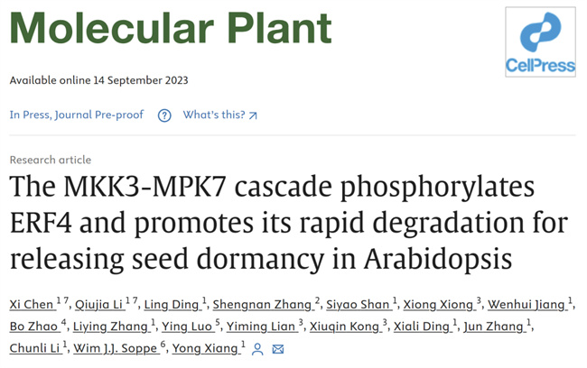 2023年9月13日,中國農(nóng)業(yè)科學(xué)院深圳農(nóng)業(yè)基因組研究所向勇課題組在Molecular Plant在線發(fā)表了題為“The MKK3-MPK7 cascade phosphorylates ERF4 and promotes its rapid degradation for releasing seed dormancy in Arabidopsis ”的研究論文。文章揭示了種子釋放休眠啟動(dòng)萌發(fā)的新機(jī)制。