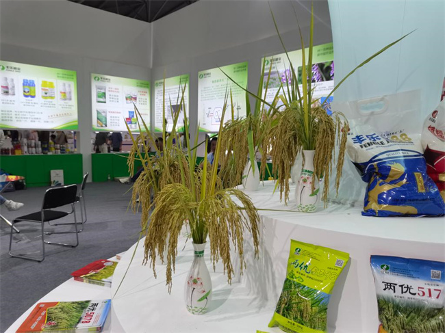 “全國種子雙交會(huì)”現(xiàn)場,合肥豐樂種業(yè)股份有限公司展臺(tái)上展示的水稻品種。新華社記者 水金辰 攝