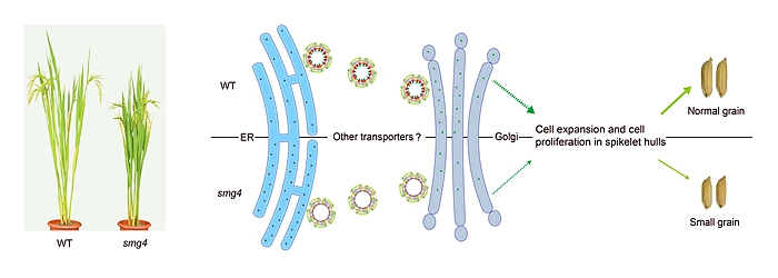 科研團(tuán)隊(duì)鑒定到一個(gè)水稻小粒突變體SMG4,該突變體籽粒的粒長、粒寬和粒厚均變小。與野生型相比,SMG4突變體穎殼中的細(xì)胞變小且數(shù)目減少。研究發(fā)現(xiàn)突變體中的SMG4基因發(fā)生突變,該基因編碼一個(gè)MATE家族的轉(zhuǎn)運(yùn)蛋白。此蛋白可與COPII囊泡組分以及細(xì)胞色素P450亞家族CYP78A的成員互作,共同調(diào)控水稻籽粒的大小。研究揭示了調(diào)控水稻籽粒大小的新通路,為水稻籽粒大小調(diào)控的分子和遺傳機(jī)制提供了新見解。