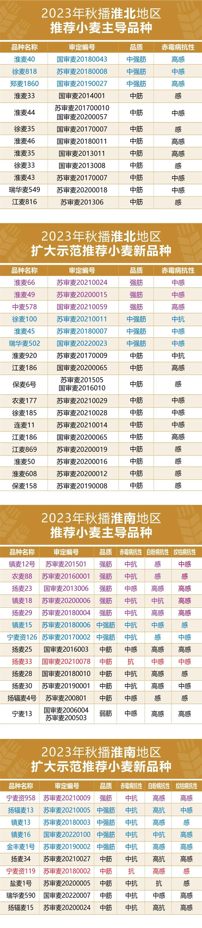 江蘇省農(nóng)業(yè)技術(shù)推廣總站在近期發(fā)布的小麥秋播技術(shù)意見中提供了一些小麥品種供廣大種植戶進(jìn)行選擇。同時(shí)各地農(nóng)業(yè)技術(shù)推廣部門也依據(jù)開展的品種評(píng)價(jià)試驗(yàn)結(jié)果推介了一批小麥新品種,各位大戶可根據(jù)需要選擇確定。