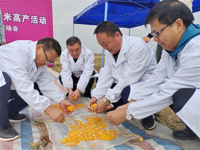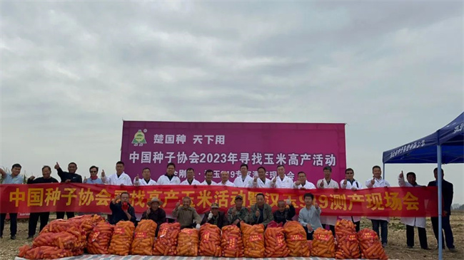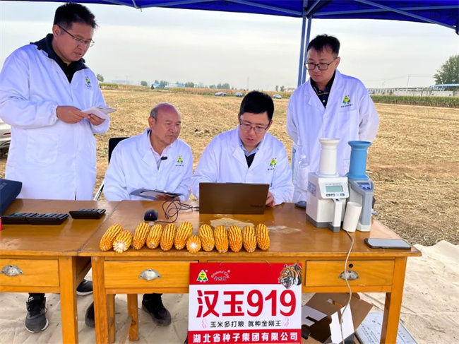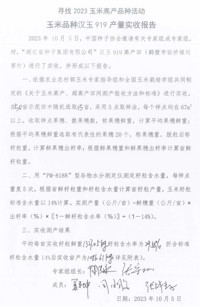 2023年10月5日,中國(guó)種子協(xié)會(huì) “尋找高產(chǎn)玉米品種活動(dòng)” 走進(jìn)河南鶴壁,湖北省種子集團(tuán)有限公司國(guó)審玉米新品種漢玉919參加當(dāng)天測(cè)產(chǎn)活動(dòng)。專家組由北京市農(nóng)林科學(xué)院陳傳永,鶴壁市農(nóng)業(yè)科學(xué)院張守林,河南省農(nóng)業(yè)科學(xué)院夏來坤,中國(guó)農(nóng)業(yè)科學(xué)院作物研究所閆鵬,河南農(nóng)業(yè)大學(xué)張戰(zhàn)輝組成。根據(jù)農(nóng)業(yè)農(nóng)村部玉米專家指導(dǎo)組和全國(guó)玉米栽培學(xué)組共同制定的《關(guān)于玉米高產(chǎn)、超高產(chǎn)田間測(cè)產(chǎn)驗(yàn)收方法和標(biāo)準(zhǔn)》,專家組對(duì)50畝漢玉919高產(chǎn)示范方進(jìn)行取樣測(cè)產(chǎn),經(jīng)專家實(shí)測(cè),漢玉919不負(fù)眾望,畝產(chǎn)達(dá)1086.61公斤(折合14%籽粒含水量),再次突破該品種高產(chǎn)紀(jì)錄!