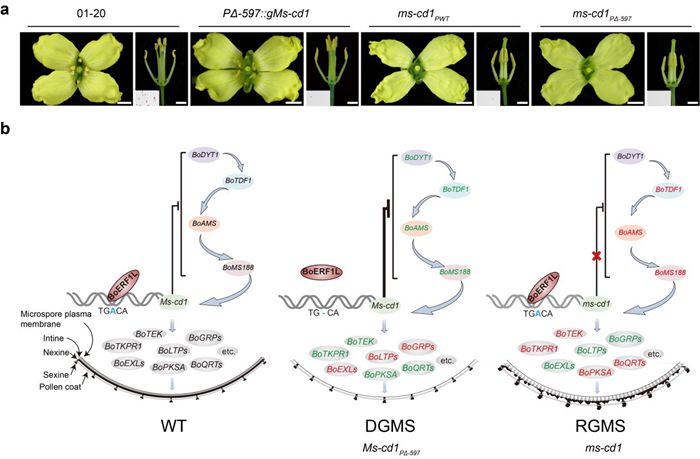 該研究通過正向遺傳學手段克隆了顯性雄性不育基因Ms-cd1,發(fā)現(xiàn)該基因啟動子區(qū)突變使其轉錄活性顯著增強,從而導致顯性雄性不育。進一步研究發(fā)現(xiàn),轉錄因子BoERF1L調控Ms-cd1的精準表達,以維持正常的雄性育性。研究還對基于該顯性雄性不育的雜交制種體系進行了優(yōu)化升級。研究結果闡明了甘藍顯性雄性不育形成的遺傳調控機理,為甘藍雜交制種提供了理論依據。
