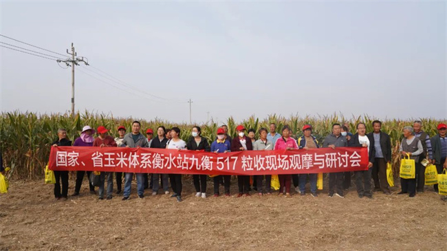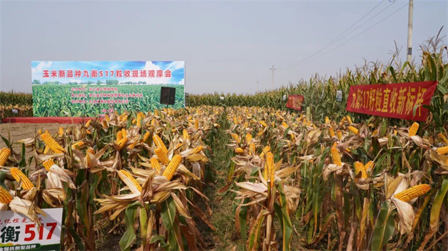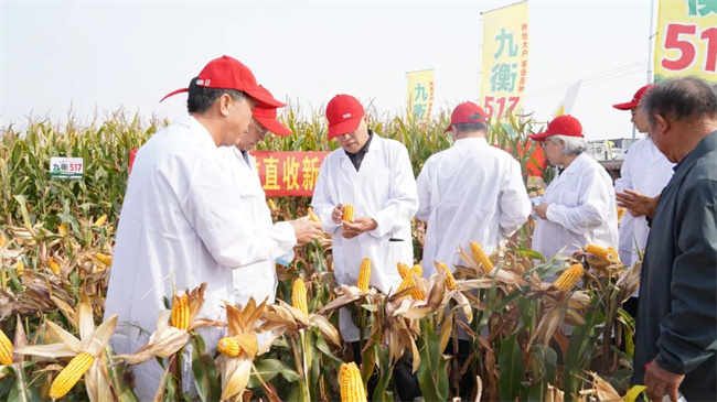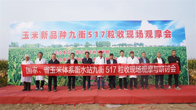 10月11日下午,由河北農(nóng)林科學院主辦,河北省農(nóng)林科學院旱作農(nóng)業(yè)研究所承辦,九圣禾種業(yè)股份有限公司協(xié)辦的九衡517粒收現(xiàn)場觀摩會在衡水景縣召開。河北省農(nóng)林科學院院黨組成員副院長王旗,河北省種子總站站長王永波,河北省農(nóng)業(yè)農(nóng)村廳科教處副處長鄭福祿,景縣縣委副書記、政府縣長李景輝,河北省農(nóng)業(yè)科學院成果轉(zhuǎn)化部王國印部長,衡水市農(nóng)業(yè)農(nóng)村局總經(jīng)濟師徐紀平,景縣農(nóng)業(yè)農(nóng)村局袁廷勛局長,山東省農(nóng)業(yè)科學院孟昭東研究員,中國農(nóng)業(yè)大學崔濤教授,河北農(nóng)業(yè)大學段會軍教授,河北省農(nóng)林科學院植物保護研究所石潔研究員,河北省農(nóng)林科學院旱作所玉米研究室主任卜俊周,九圣禾種業(yè)股份公司生產(chǎn)事業(yè)部總經(jīng)理趙文奇以及當?shù)胤N植大戶及新型經(jīng)營主體、經(jīng)銷商代表120余人共同見證了國審玉米新品種九衡517籽粒機收現(xiàn)場會。