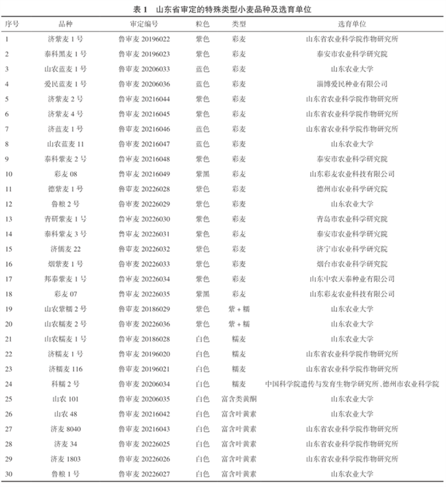 新中國成立70多年來,特別是改革開放40多年來,我國糧食生產取得舉世矚目成就,逐步實現著從“吃不飽”到“吃得飽”,再到“吃得好”“吃得健康”的歷史性轉變。為適應國民經濟和人民生活水平提高的需要,我國農作物育種導向也發(fā)生了重大變化。2017年農業(yè)部發(fā)布的《主要農作物品種審定標準》(國品審〔2017〕1號),將小麥品種分為高產穩(wěn)產品種、綠色優(yōu)質品種和特殊類型品種三大類型,而特殊類型品種為首次提出。山東省農業(yè)廳根據國家農作物品種審定標準精神,也制定了相應的特殊類型品種試驗和審定規(guī)定,將彩色小麥、糯小麥、其他類型小麥確定為特殊類型小麥品種。2018-2022年底山東共審定特殊類型小麥品種32個。為了同我國其他省份統(tǒng)一,本文僅對山東省近5年審定的彩色小麥和糯小麥品種進行分析(2個耐鹽小麥品種暫不列入,下同),以期為下一步特殊類型小麥育種及其產業(yè)化發(fā)展提供借鑒與參考。