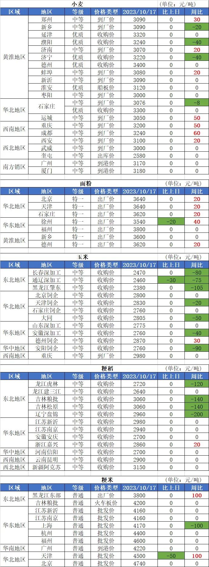 2、10月17日玉米價(jià)格小幅下跌,其中:南北港口、南方銷區(qū)玉米價(jià)格小幅下跌,跌幅10-50元/噸;華北地區(qū)、東北地區(qū)玉米價(jià)格基本穩(wěn)定,局部價(jià)格小幅下跌,跌幅10-30元/噸。