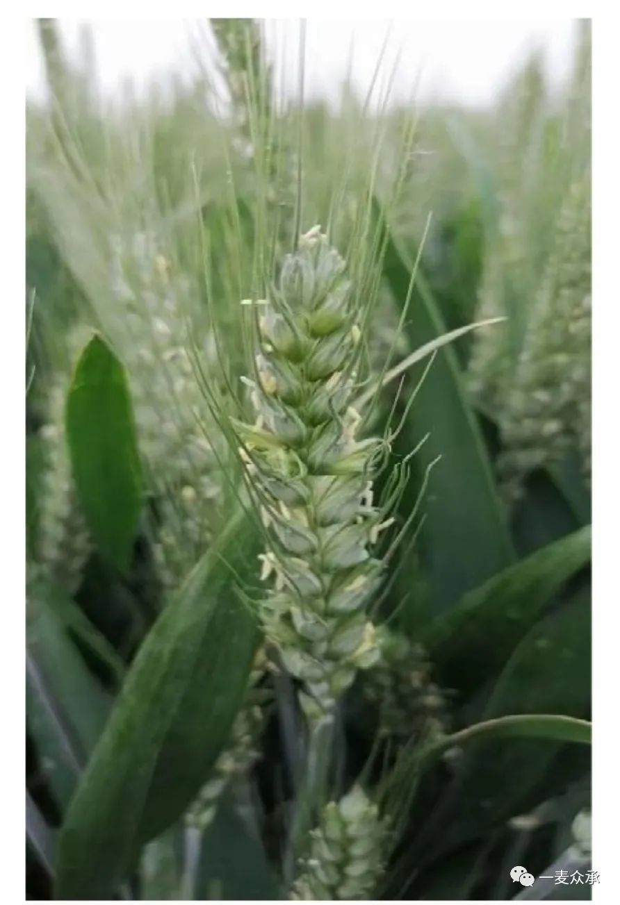 具體表現(xiàn)為:花絲長、花藥大、花粉量多,穎殼張開角度較小等都與結(jié)實(shí)性好有關(guān),如果穎殼張角很大,說明雄花已經(jīng)失去了作用,柱頭正等著外來花粉。開花后,花藥能夠順利的從穎殼中脫離出來,俗稱:“掛花”。掛花到底或者到頂預(yù)示著不育小穗數(shù)低,結(jié)實(shí)性佳。從遺傳的角度來看,小麥開花習(xí)性好壞與品種適應(yīng)性相關(guān),開花習(xí)性好的類型適應(yīng)性也較好。這里借用劉加平老師的一張照片來描述“掛花”這一現(xiàn)象。