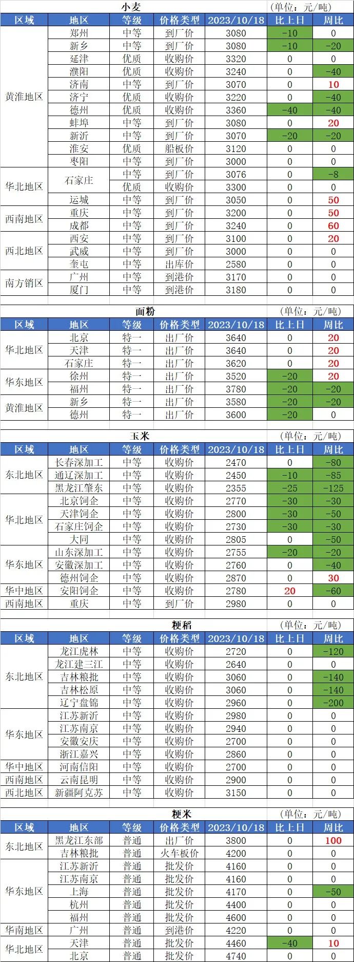2、10月18日玉米價(jià)格繼續(xù)下跌,其中:南方銷區(qū)玉米價(jià)格基本穩(wěn)定;華北地區(qū)、東北地區(qū)、南北港口玉米價(jià)格基本穩(wěn)定,局部價(jià)格小幅下跌,跌幅10-70元/噸。