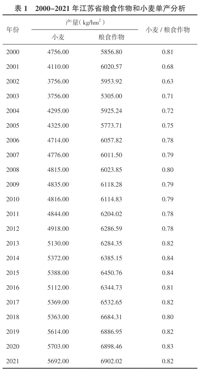 由表1可知,2000-2021年江蘇省糧食作物小麥單產(chǎn)水平整體呈現(xiàn)上升趨勢(shì),且小麥單產(chǎn)水平普遍低于糧食作物單產(chǎn)水平,平均約為江蘇省糧食作物單產(chǎn)水平的0.8倍。2000-2006年江蘇省小麥單產(chǎn)水平上下波動(dòng)較大;其中,2002-2003年小麥單產(chǎn)水平僅有3756.00kg/hm²;2016年后,小麥單產(chǎn)水平穩(wěn)步提升,2020年小麥單產(chǎn)水平達(dá)最高5703.00kg/hm²,小麥單產(chǎn)水平的大幅度提升,說(shuō)明小麥在良種繁育和栽培管理方法上的完善。