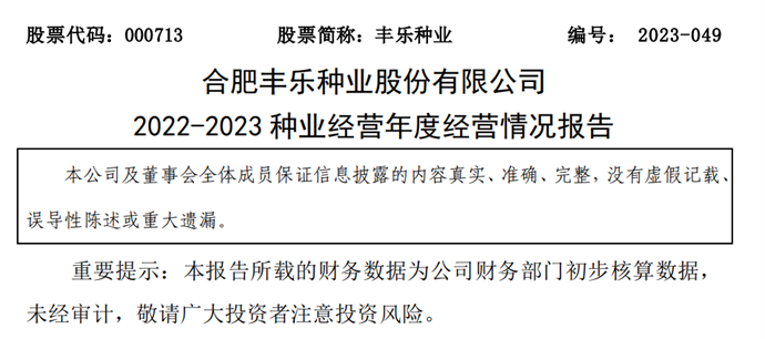 近日,合肥豐樂種業(yè)根據(jù)生產(chǎn)經(jīng)營實際情況,披露2022—2023種業(yè)經(jīng)營年度經(jīng)營情況。本次披露數(shù)據(jù)為公司2022年8月1日到2023年7月31日種業(yè)經(jīng)營情況。