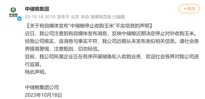 10月18日,“中儲糧集團”官方微博發(fā)布關(guān)于有自媒體發(fā)布“中儲糧停止收購玉米”不實信息的聲明。全文如下: