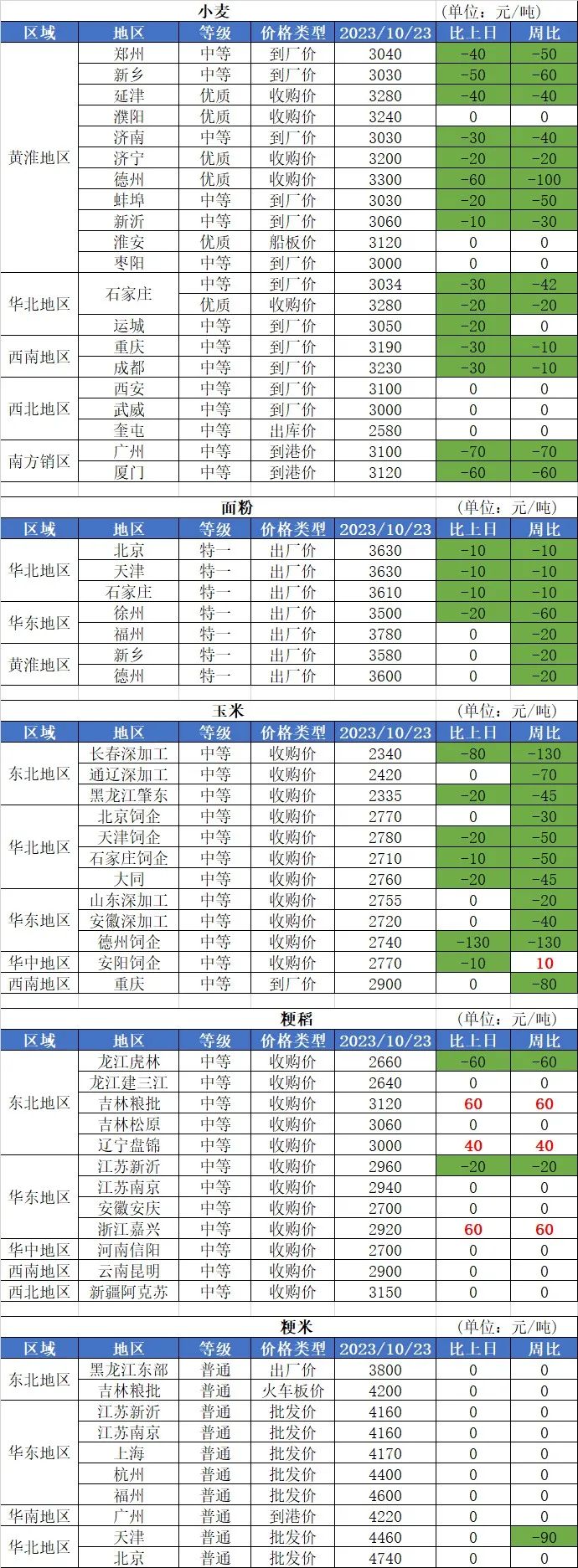 2、10月23日玉米價(jià)格穩(wěn)中有跌,其中:南北港口、南方銷(xiāo)區(qū)玉米價(jià)格基本穩(wěn)定;華北地區(qū)、東北地區(qū)玉米價(jià)格基本穩(wěn)定,局部?jī)r(jià)格小幅下跌,跌幅10-60元/噸。