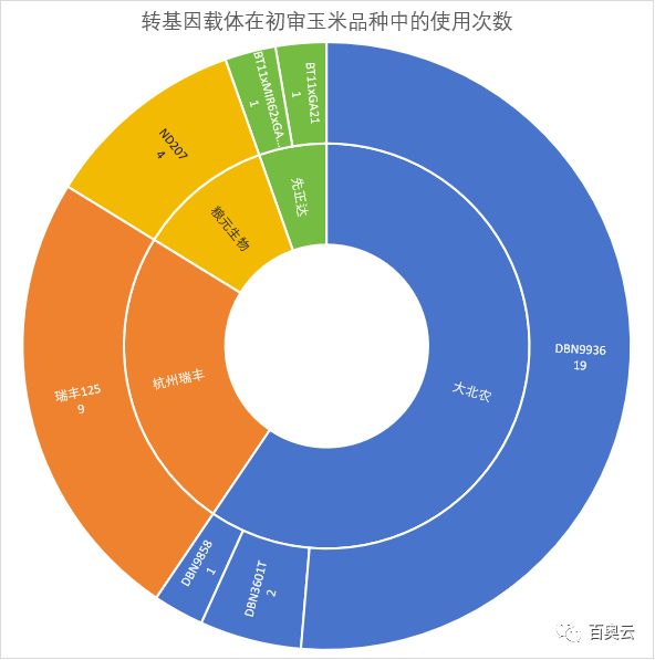 從本次初審公布的玉米品種所使用轉(zhuǎn)化體數(shù)量來(lái)看,老牌生物技術(shù)公司大北農(nóng)公司先發(fā)優(yōu)勢(shì)明顯,有 22 個(gè)玉米品種使用了其載體,其中19 個(gè)品種使用了 DBN9936。杭州瑞豐公司的瑞豐 125 被 9 個(gè)品種采用,實(shí)力強(qiáng)勁。后起之秀糧元生物的 ND207 有 4 個(gè)品種采用,另有 2 個(gè)品種使用先正達(dá)/中種集團(tuán)的載體。