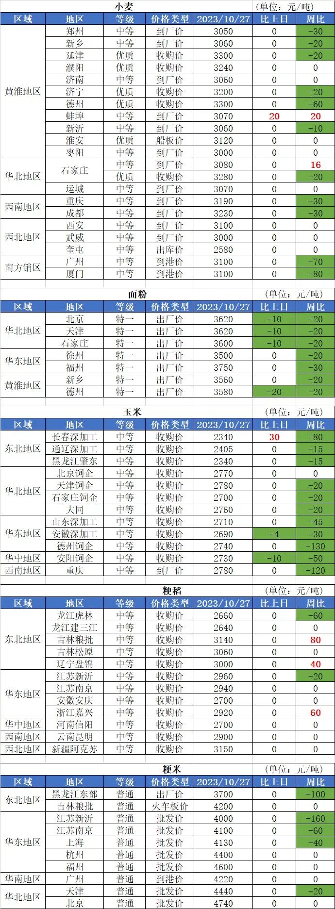 2、10月27日玉米價(jià)格穩(wěn)中有跌,其中:南北港口、南方銷區(qū)玉米價(jià)格基本穩(wěn)定;華北地區(qū)、東北地區(qū)玉米價(jià)格基本穩(wěn)定,局部?jī)r(jià)格小幅下跌,跌幅10-20元/噸。