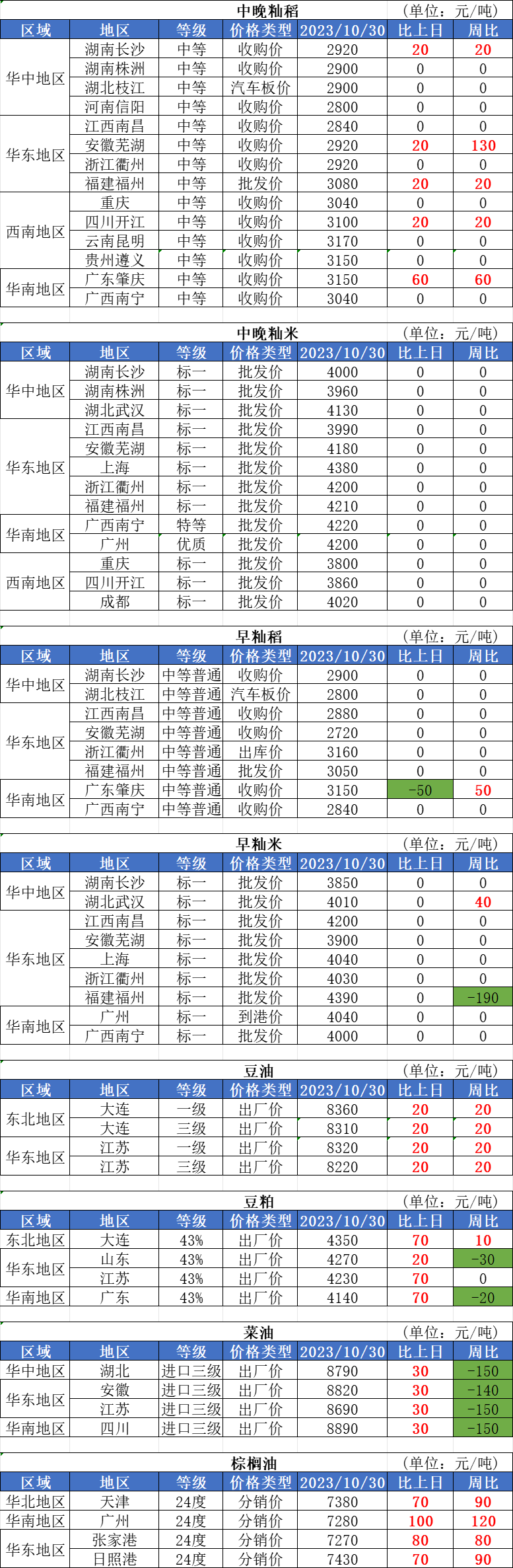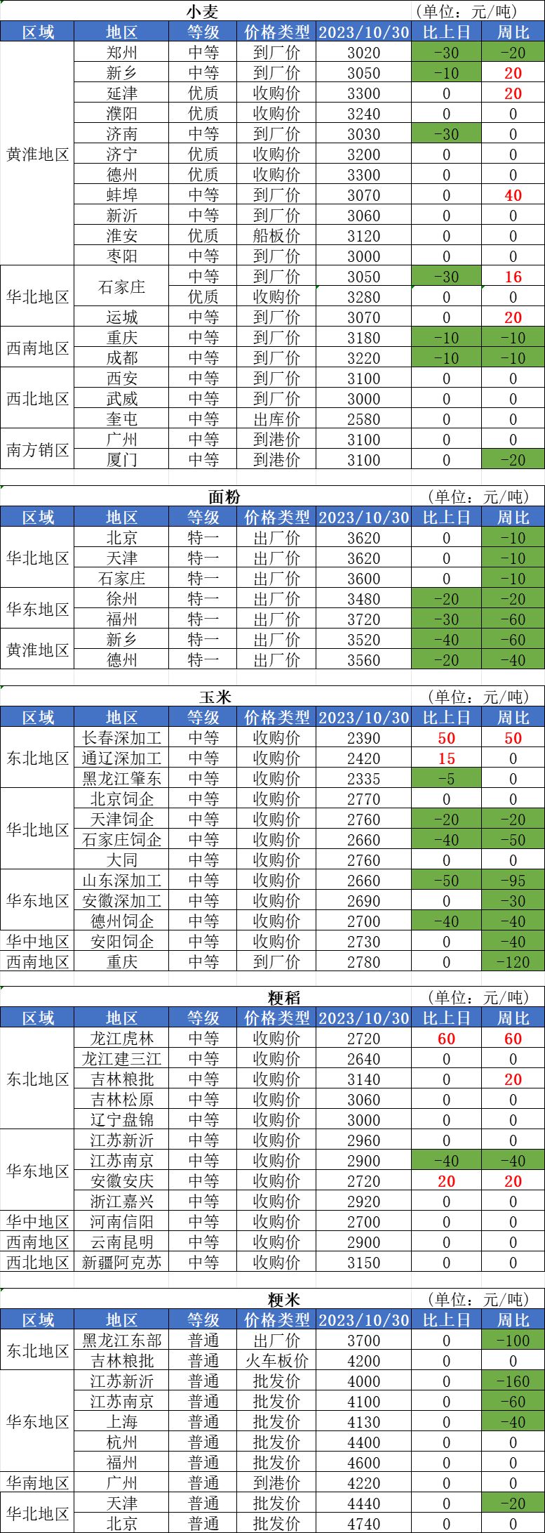 2、10月30日玉米價(jià)格穩(wěn)中有跌,其中:南北港口玉米價(jià)小幅下跌,跌幅10元/噸;東北地區(qū)玉米價(jià)格基本穩(wěn)定,局部?jī)r(jià)格有所震蕩,變化幅度20-50元/噸;華北地區(qū)、南方銷區(qū)玉米價(jià)格基本穩(wěn)定,局部?jī)r(jià)格小幅下跌,跌幅10-40元/噸。