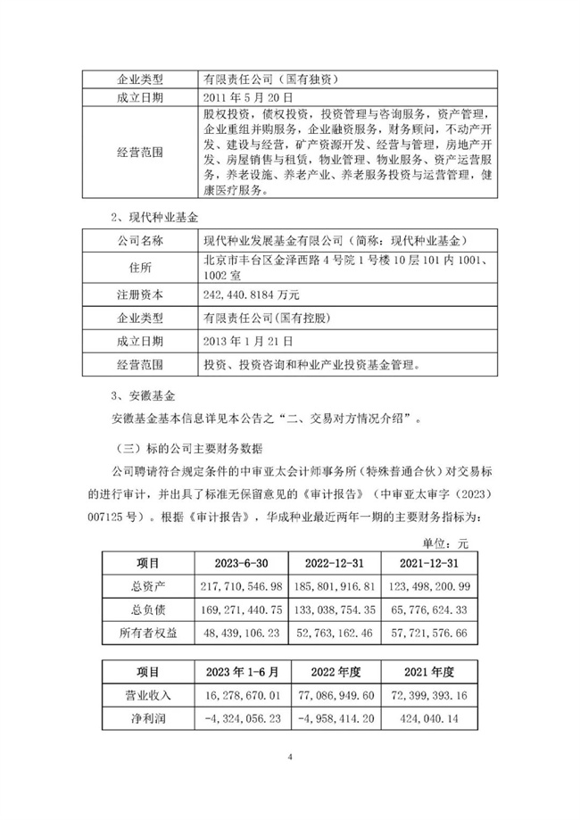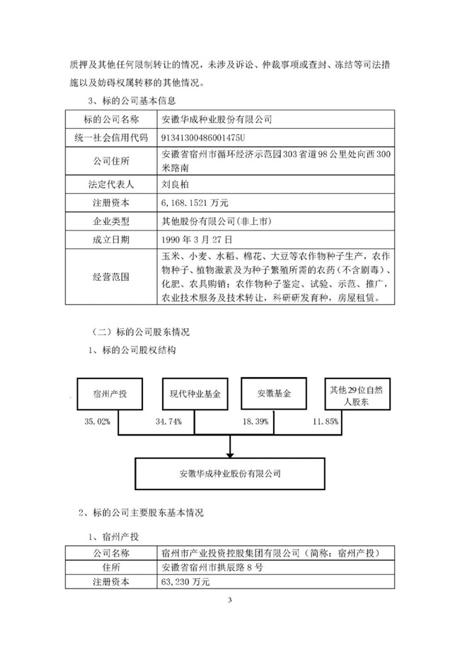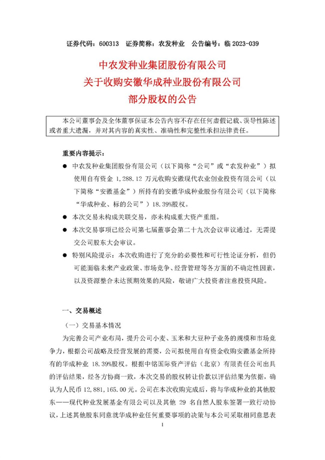 11月6日,農(nóng)發(fā)種業(yè)發(fā)布公告,擬使用自有資金1288.12萬(wàn)元收購(gòu)安徽現(xiàn)代農(nóng)業(yè)創(chuàng)業(yè)投資有限公司(簡(jiǎn)稱“安徽基金”)所持有的安徽華成種業(yè)股份有限公司(簡(jiǎn)稱“華成種業(yè)”)18.39%股權(quán)。