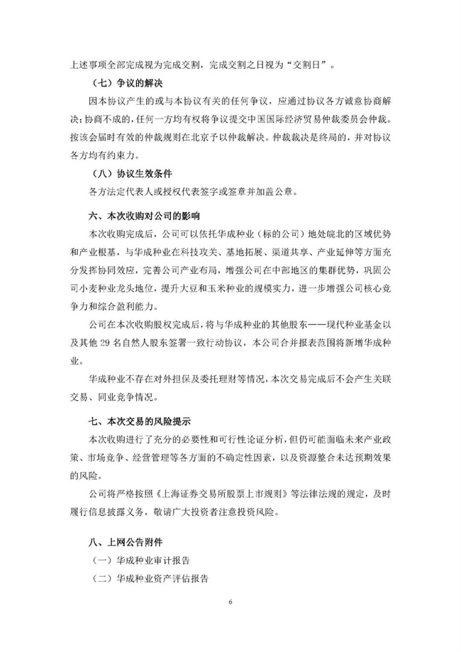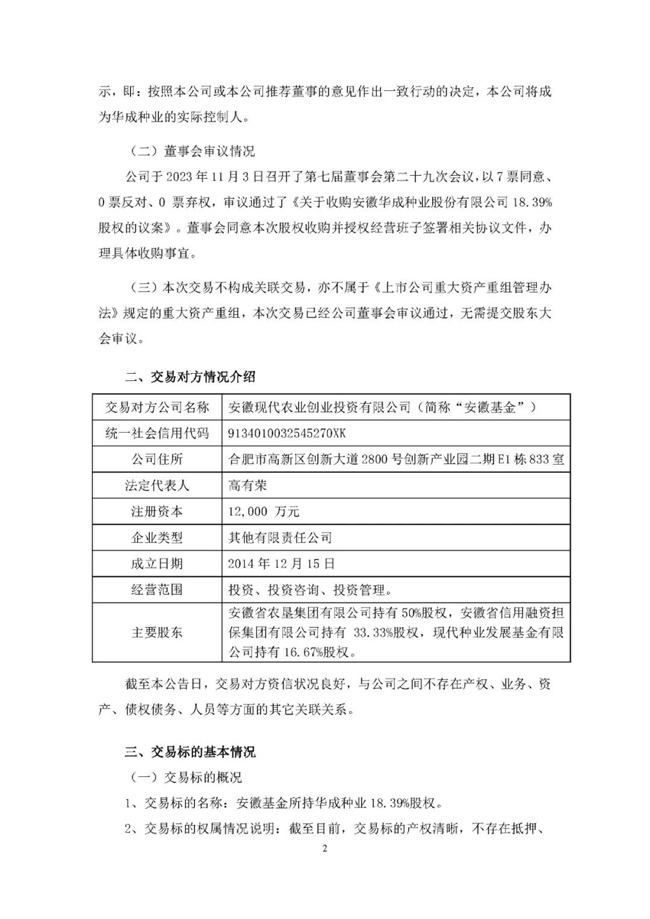 公司在本次收購(gòu)?fù)瓿珊螅瑢⑴c華成種業(yè)的其他股東——現(xiàn)代種業(yè)發(fā)展基金有限公司以及其他29名自然人股東簽署一致行動(dòng)協(xié)議,上述其他股東同意就華成種業(yè)任何重要事項(xiàng)的決策與本公司采取相同意思表示,即:按照本公司或本公司推薦董事的意見(jiàn)作出一致行動(dòng)的決定,本公司將成為華成種業(yè)的實(shí)際控制人。