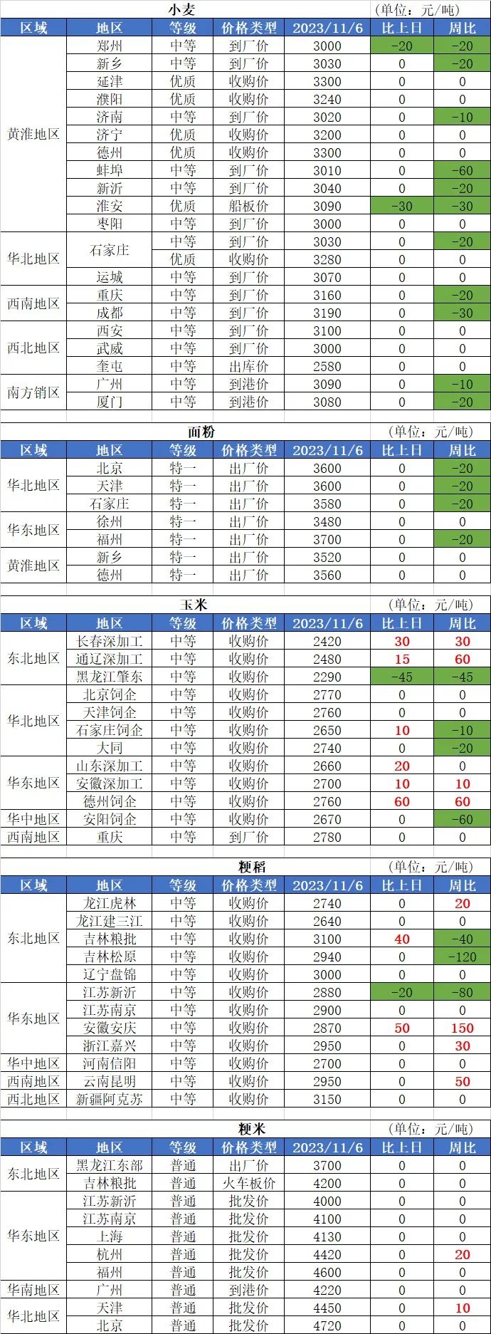 2、11月6日玉米價格局部上漲,其中:南北港口、南方銷區(qū)玉米價基本穩(wěn)定;華北地區(qū)玉米價格上漲,漲幅10-40元/噸;東北地區(qū)玉米價格基本穩(wěn)定,局部價格小幅上漲,漲幅10-40元/噸。