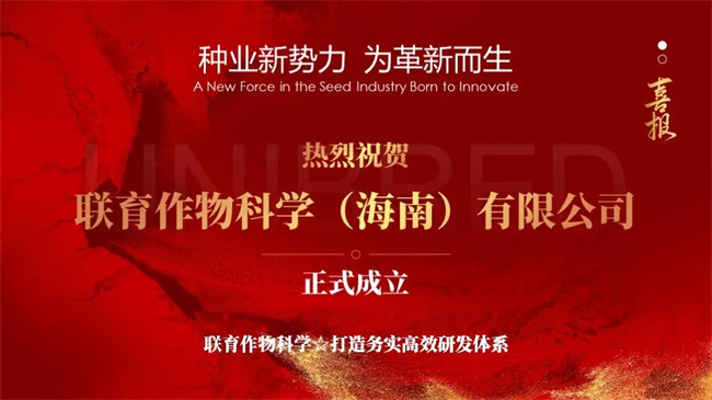 熱烈祝賀聯(lián)育作物科學(xué)(海南)有限公司正式成立。聯(lián)育作物科學(xué)種業(yè)新勢力,為革新而生,打造務(wù)實高效研發(fā)體系。