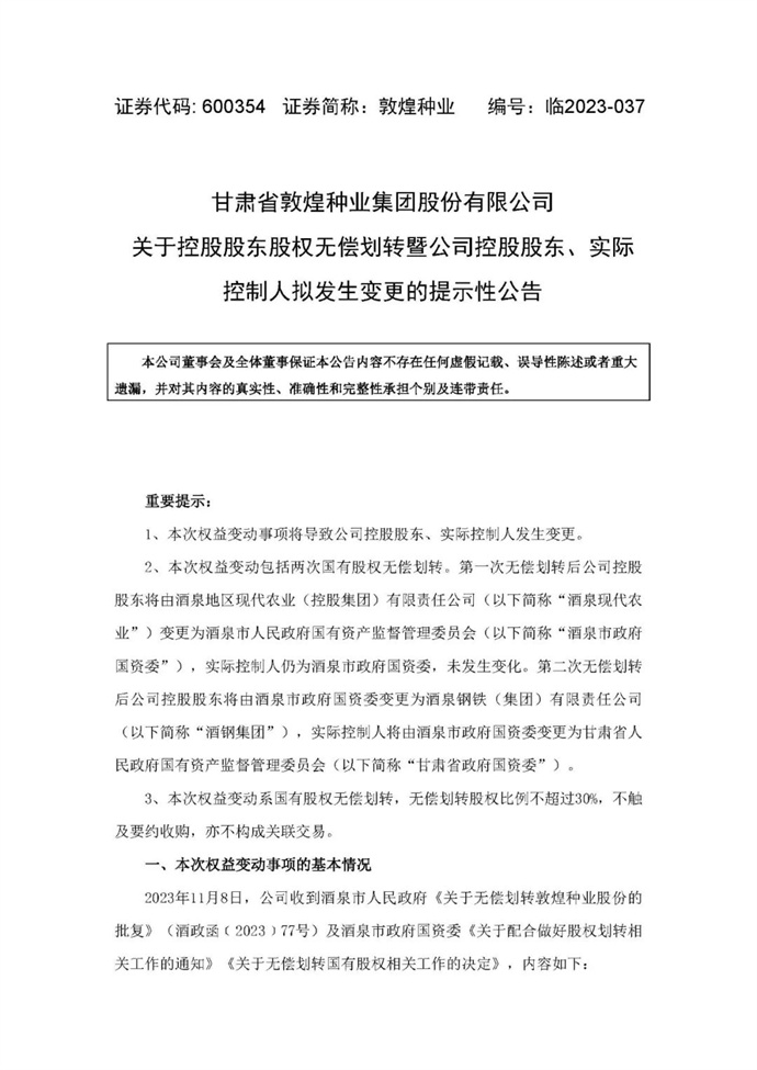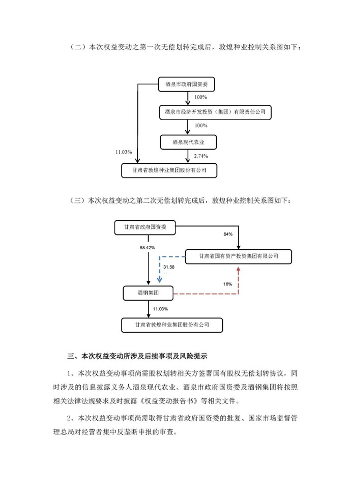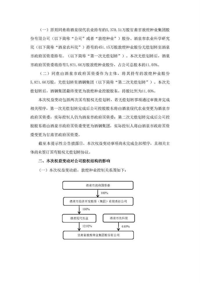 本次權(quán)益變動(dòng)包括兩次國(guó)有股權(quán)無(wú)償劃轉(zhuǎn),若無(wú)償劃轉(zhuǎn)事項(xiàng)通過(guò)審批并完成相關(guān)程序,第一次無(wú)償劃轉(zhuǎn)完成后公司控股股東將由酒泉現(xiàn)代農(nóng)業(yè)變更為酒泉市政府國(guó)資委,實(shí)際控制人仍為酒泉市政府國(guó)資委;第二次無(wú)償劃轉(zhuǎn)完成后公司控股股東將由酒泉市政府國(guó)資委變更為酒鋼集團(tuán),實(shí)際控制人將由酒泉市政府國(guó)資委變更為甘肅省政府國(guó)資委。