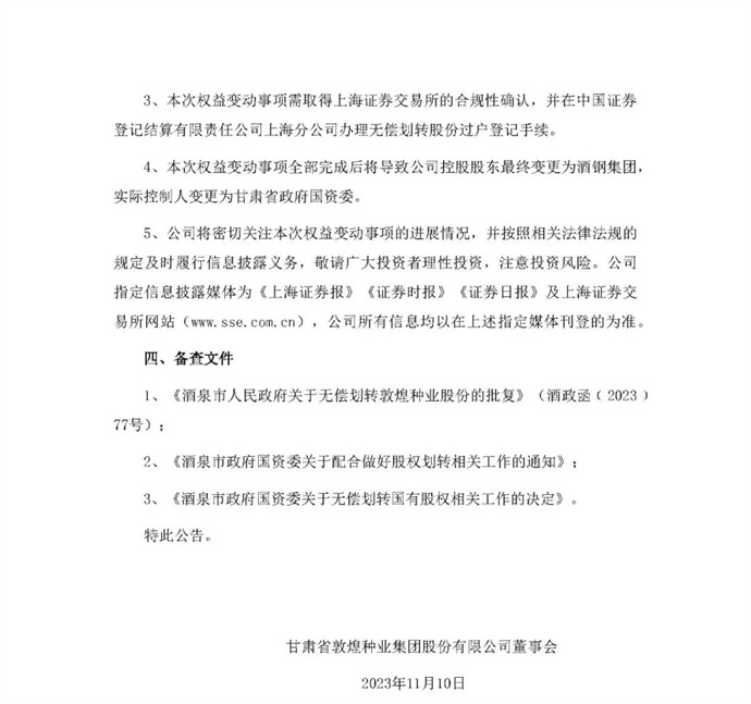 敦煌種業(yè)11月9日公告,11月8日,公司收到酒泉市人民政府《關(guān)于無(wú)償劃轉(zhuǎn)敦煌種業(yè)股份的批復(fù)》及酒泉市政府國(guó)資委《關(guān)于配合做好股權(quán)劃轉(zhuǎn)相關(guān)工作的通知》《關(guān)于無(wú)償劃轉(zhuǎn)國(guó)有股權(quán)相關(guān)工作的決定》。