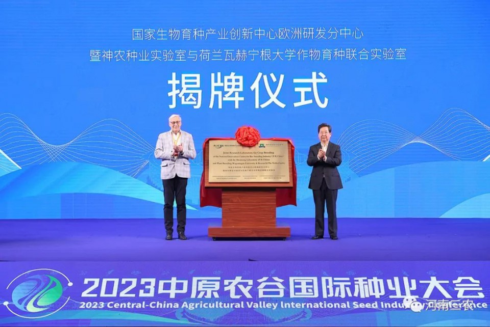 樓陽(yáng)生宣布大會(huì)開(kāi)幕,與荷蘭皇家科學(xué)與人文學(xué)會(huì)院士、歐洲植物育種協(xié)會(huì)前主席理查德·威薩共同為“國(guó)家生物育種產(chǎn)業(yè)創(chuàng)新中心歐洲研發(fā)分中心暨神農(nóng)種業(yè)實(shí)驗(yàn)室與荷蘭瓦赫寧根大學(xué)作物育種聯(lián)合實(shí)驗(yàn)室”揭牌。