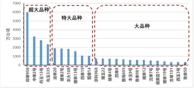 同時(shí)參考《國(guó)務(wù)院關(guān)于調(diào)整城市規(guī)模劃分標(biāo)準(zhǔn)的通知國(guó)發(fā)[2014]51 號(hào)》中對(duì)于我國(guó)城市的劃分標(biāo)準(zhǔn),將大品種劃分為 3 類(lèi),第 1 類(lèi)為超大品種,即累計(jì)推廣面積 2000 萬(wàn)公頃以上品種;第 2 類(lèi)為特大品種,即累計(jì)推廣面積 1000 萬(wàn)公頃以上2000 萬(wàn)公頃以下的品種;第 3 類(lèi)為大品種,即累計(jì)推廣面積 333.3 萬(wàn)公頃以上 1000 萬(wàn)公頃以下的品種。