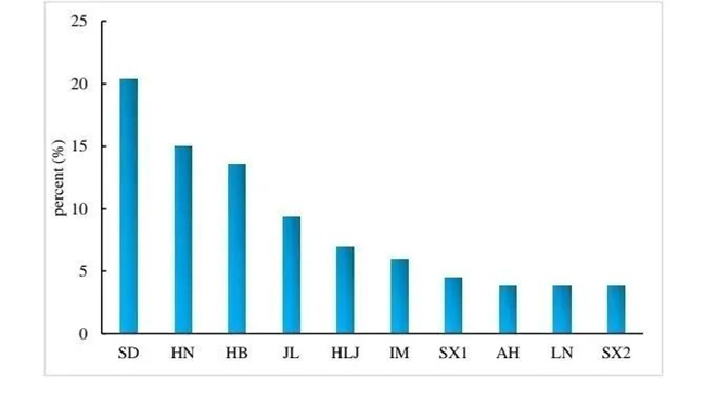 對(duì)玉米大品種各省市自治區(qū)的種植面積分析表明,近 40 年來(lái)在全國(guó) 28 個(gè)省市自治區(qū)均有分布,前十位分別是山東、河南、河北、吉林、黑龍江、內(nèi)蒙古、山西、安徽、遼寧、陜西(圖1),所占比例為3.75%~20.35%,其中高于5%以上的分別是山東(20.35%)、河南(14.98%)、河北(13.57%)、吉林(9.34%)、黑龍江(6.95%)、內(nèi)蒙古(5.87%),共占71.06%。