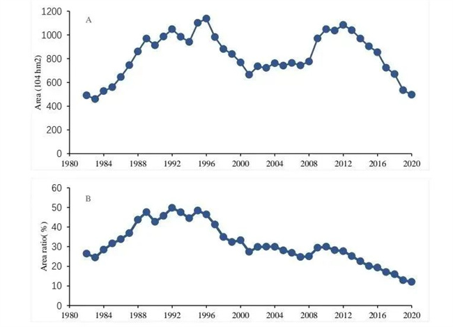大品種面積占比在12.04%~49.80% (圖3-B),平均31.34%,總的變化趨勢(shì)是由上升到趨穩(wěn)再下降,1982—1989年呈快速上升,由26.48%提高到47.61%,平均占比34.13%;1990—1997年這8年期間都在40%以上,平均占比45.79%;其后23年進(jìn)入下降期,大品種面積占比由34.9%逐步下降到12.04%,平均占比25.35%。