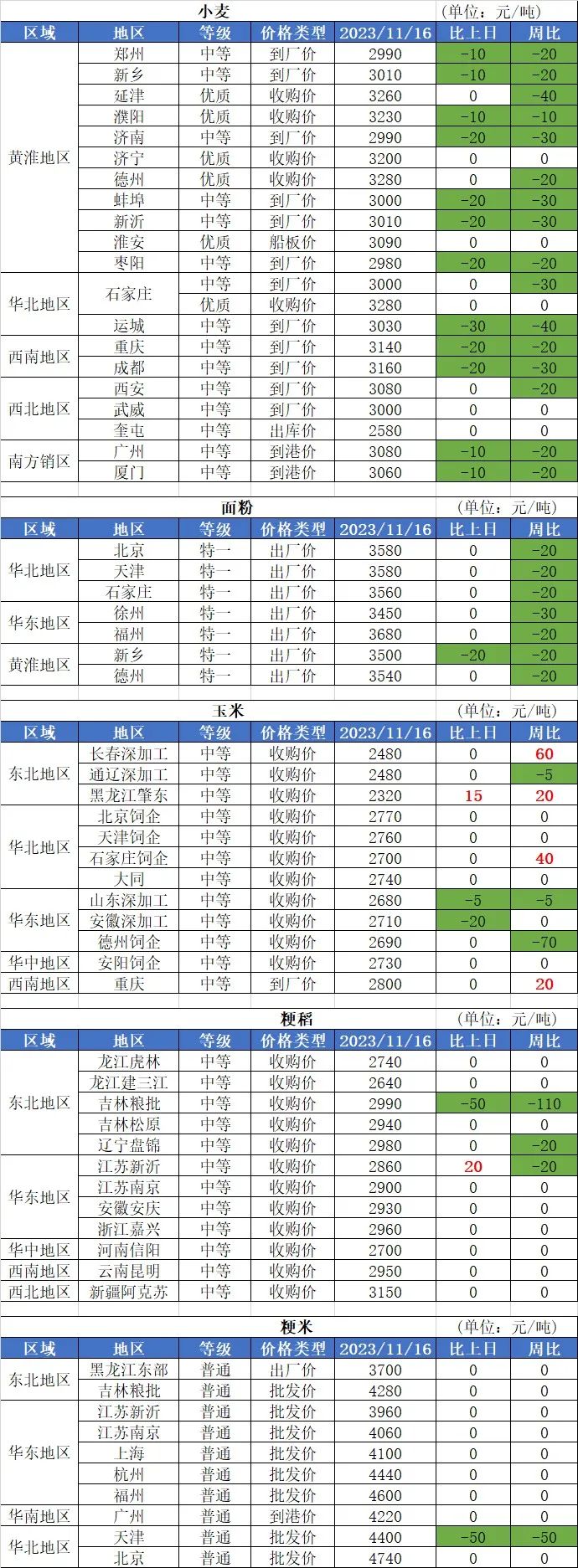 2、11月16日國內玉米價格小幅調整,其中:南北港口、南方銷區(qū)玉米價格基本穩(wěn)定;華北地區(qū)玉米價格基本穩(wěn)定,局部價格小幅下跌,跌幅10元/噸;東北地區(qū)玉米價格基本穩(wěn)定,局部價格小幅漲跌,漲幅10元/噸。
